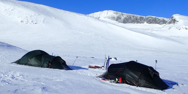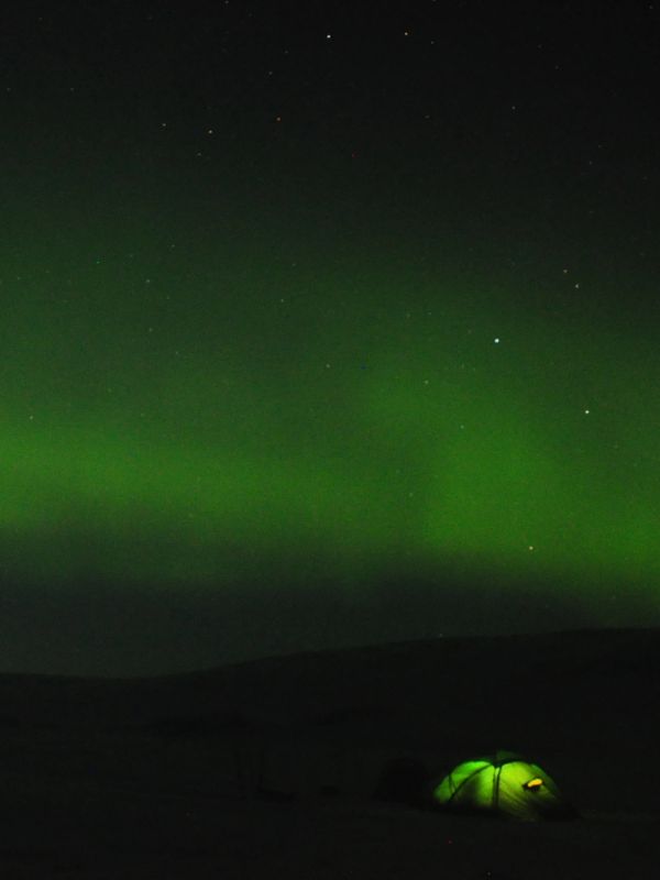Ik trek de rits van mijn tentje open, ijskoude vrieslucht rolt naar binnen. Als ik mijn hoofd door het tentzeil steek, zie ik de tent waar mijn vrouw met de kinderen in slapen. Als moeilijke, onrustige slaper geef ik er tijdens wintertrektochten sowieso de voorkeur aan om de vriesnacht alleen door te brengen, om de rest van het gezin niet teveel wakker te houden. Achter onze tenten prijkt de machtige helagsfjäll...