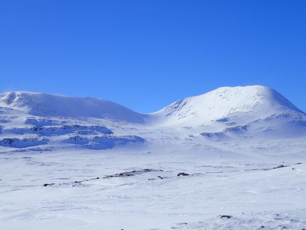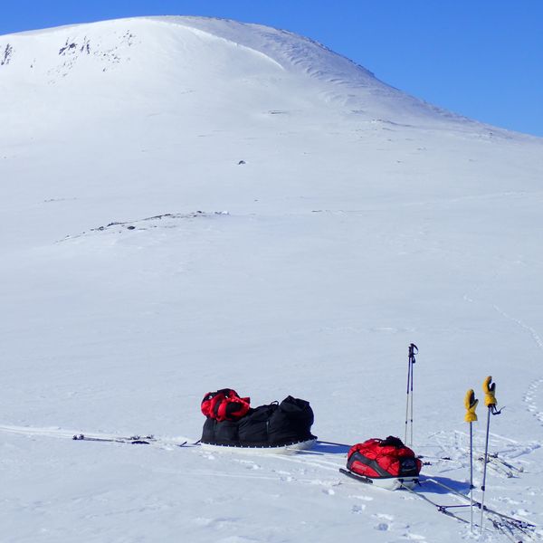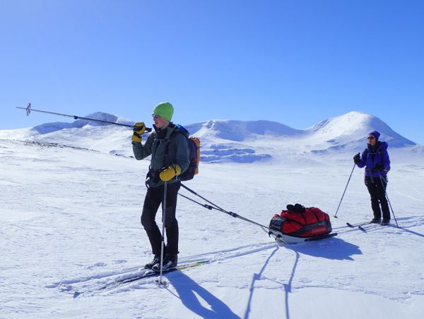De wind is ondertussen wat geluwd en door de harde, quasi verglaasde sneeuwbodem glijden de kilometers onder de backcountry ski’s vlot en comfortabel voorbij. April betekent ook doorgaans wat minder extreme dagen met hogedrukweer. Dat is vandaag niet anders. Ik geniet intens. Je eigen vrouw en kinderen, voorzien van een trekslede of rugzak door dit landschap zien bewegen, het doet me wat. Kleinschalig zijn we ooit begonnen met sneeuwrakettentochtjes of winterwandelingen in de middelgebergten van Europa en nu zijn we toe aan onze derde wintertrekking op Zweedse bodem...