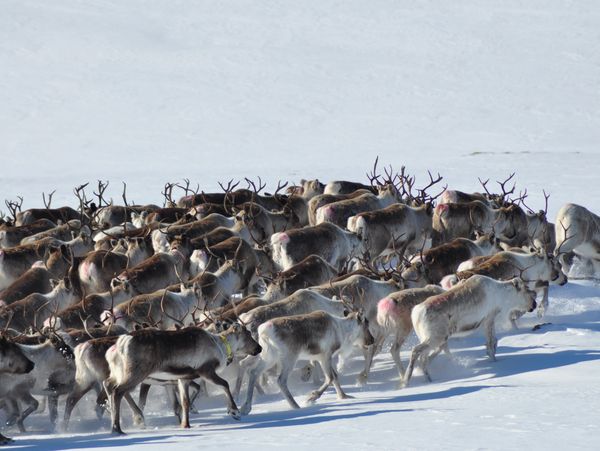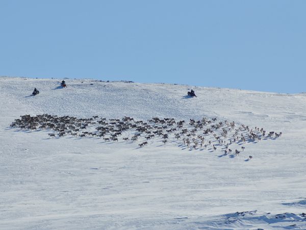 Honderden rendieren draven de helling naar beneden gevolgd door nog eens honderden anderen dieren die een beetje verderop naar beneden komen. Komen ze zomaar spontaan naar beneden gedonderd? Neen, Sami op sneeuwscooters drijven de rendieren op en brengen ze schijnbaar nu al naar hun zomerse graasgronden verder noordwaarts in de bergen. We wanen ons midden in een National Geographic natuurdocumentaire....